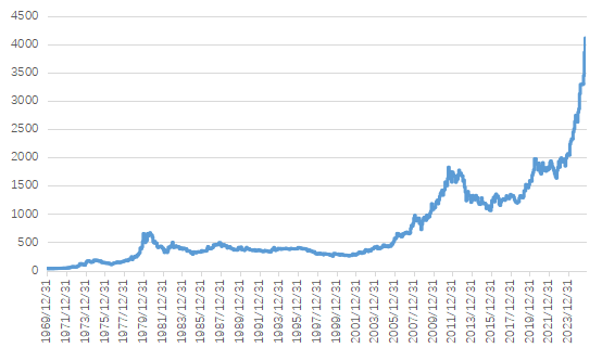 数据来源:Wind,图中展示伦敦现货黄金价格,单位为美元/盎司,按月统计,统计区间为1969/12/31-2025/10/23。