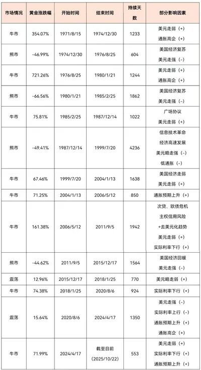 驱动黄金价格的因素比较复杂,其价格波动也难有一般规律可循,一次起落周期有时很长、有时很短。例如下面所列不同时期对黄金走势的部分影响因素,黄金市场每一轮牛熊变换背后的原因都各不相同。