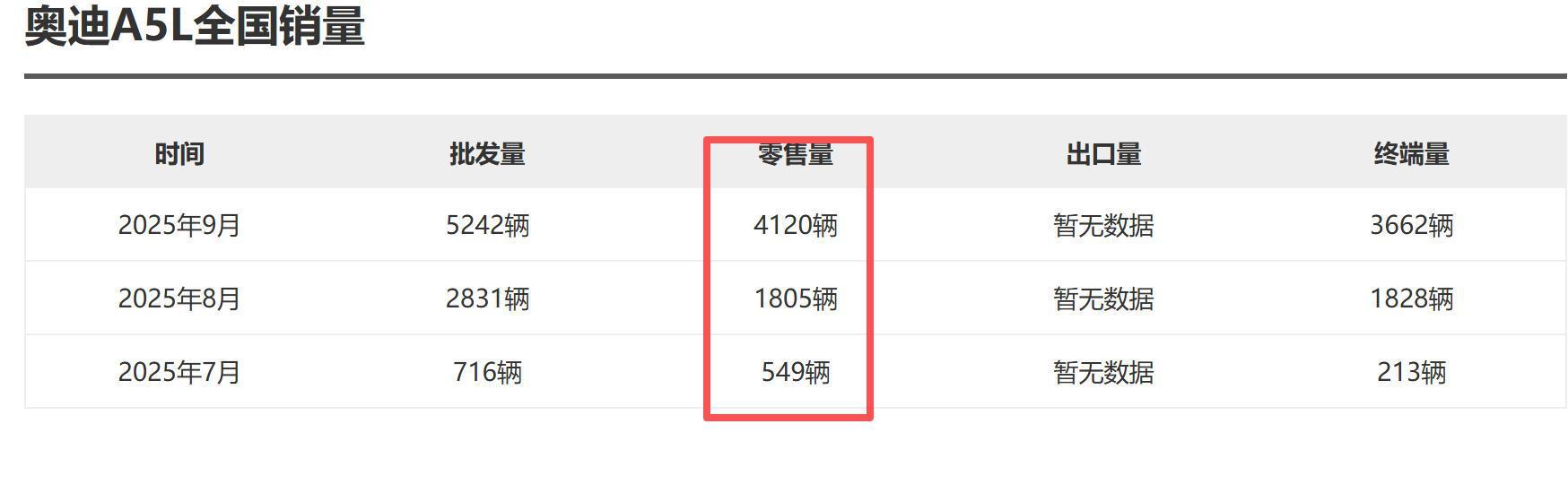 来自第三方平台公开的销量数据显示,一汽奥迪A5L在8月份的零售销量为1805辆,9月份则进一步攀升至了4120辆,虽然和宝马3系、奔驰C级等对手相比,销量上似乎差点意思,但其实并不难理解。