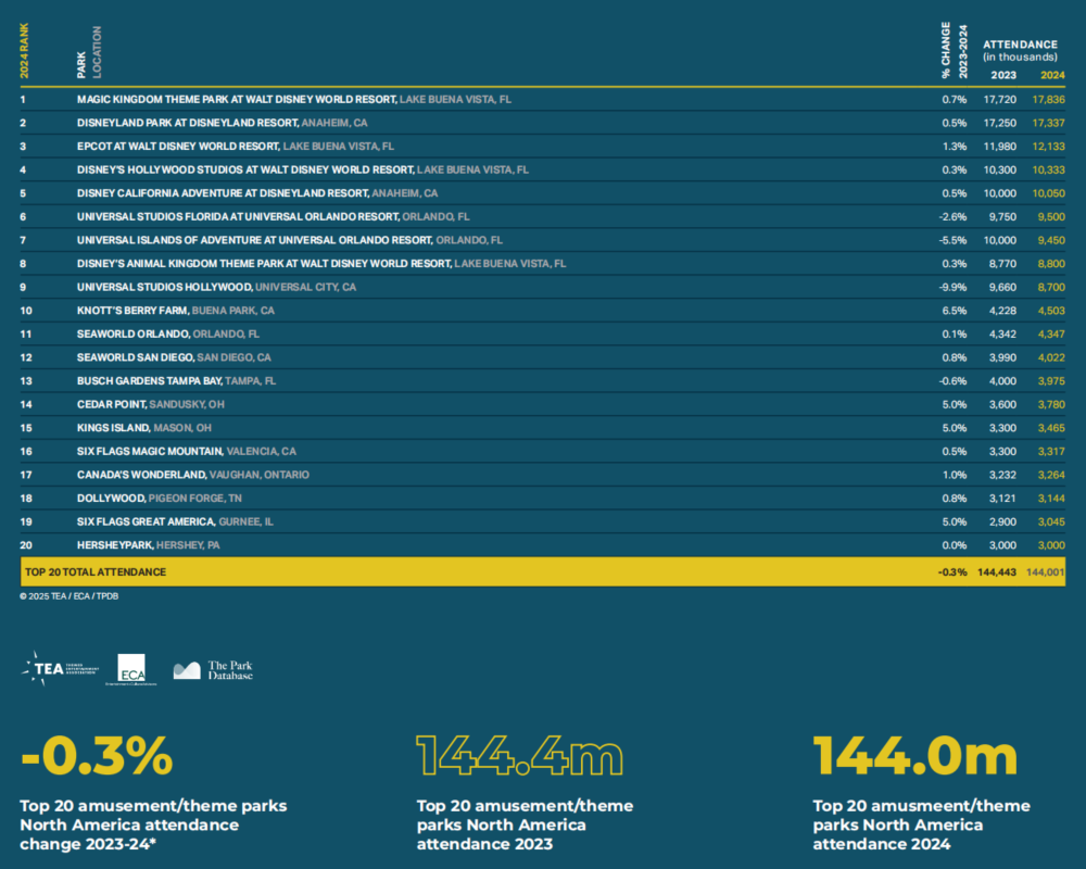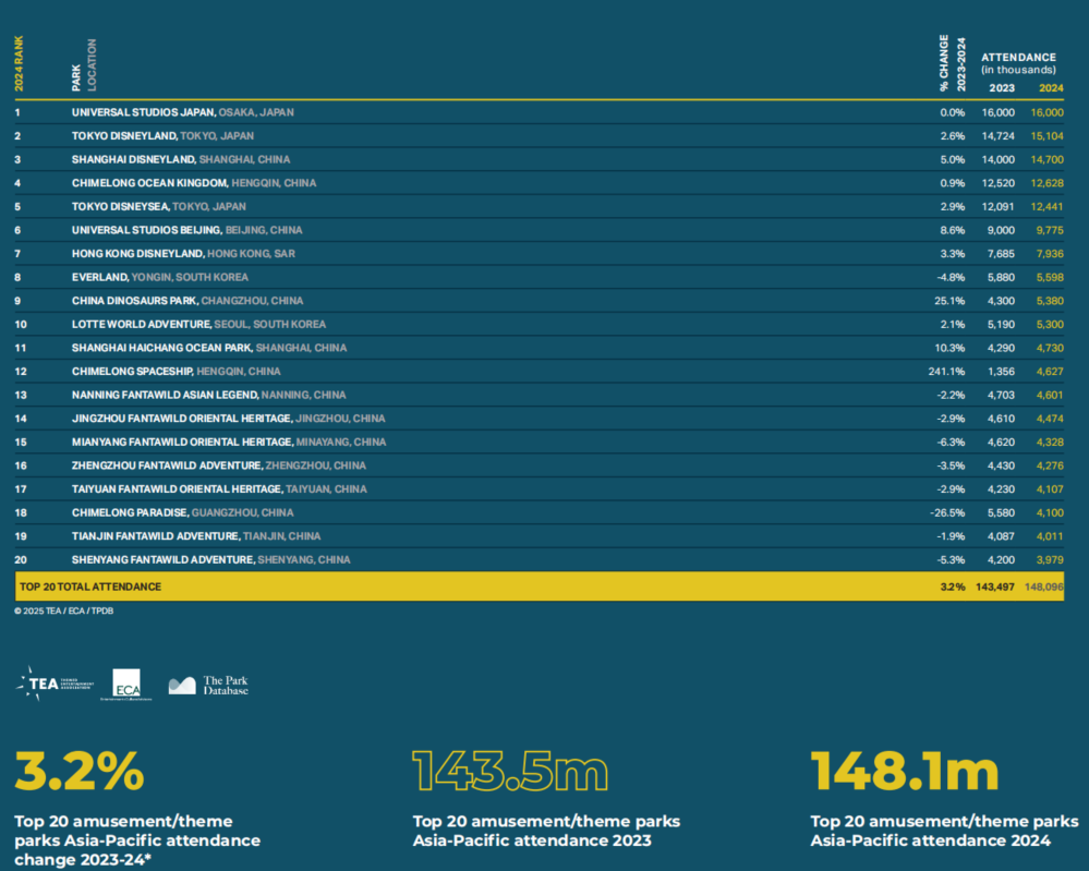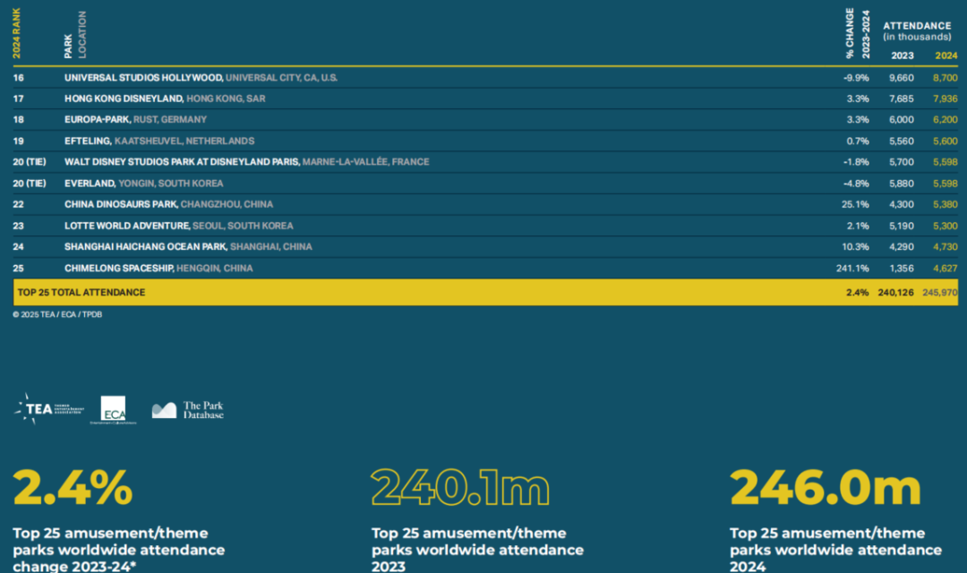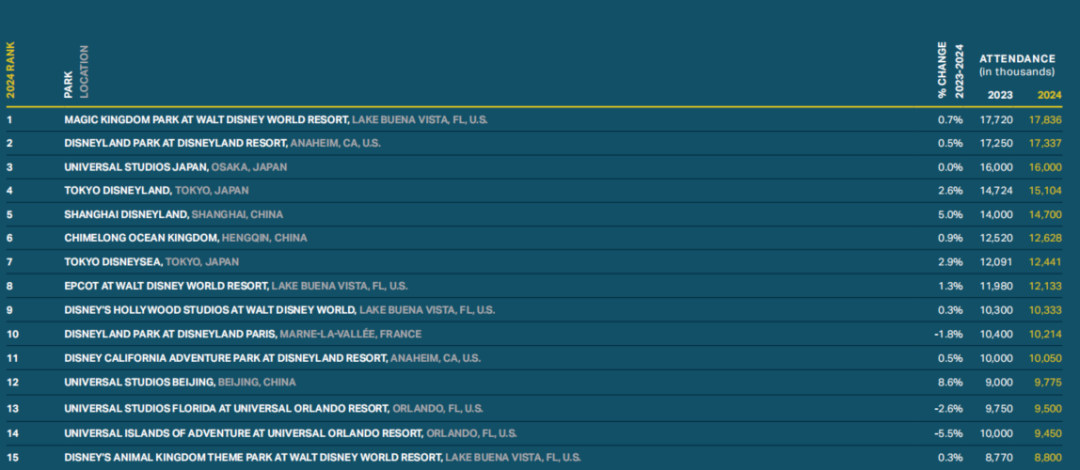 全球主题公园前25强名单 图源:2024TEA全球体验指数报告
