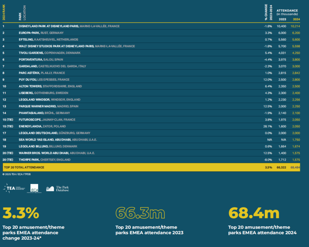 EMEA地区主题公园前20强名单 图源:2024TEA全球体验指数报告