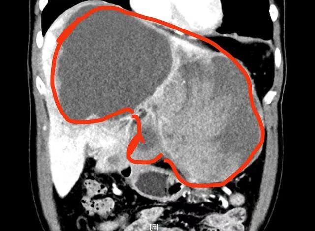 按照胃病治疗一段时间后,刘先生的症状不但没有好转,反而越发吃不下东西,只得利用国庆长假回到老家进一步检查。当CT结果出来后,刘先生如遭晴天霹雳——在他的胃和肝脏之间有一个22×21×14厘米的巨大肿瘤!正是由于肿瘤挤压胃部,才导致他进食困难、吃啥吐啥。