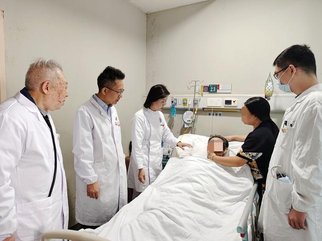(▲吴金术教授、段小辉主任、李霞护士长等查看刘先生术后恢复情况。)