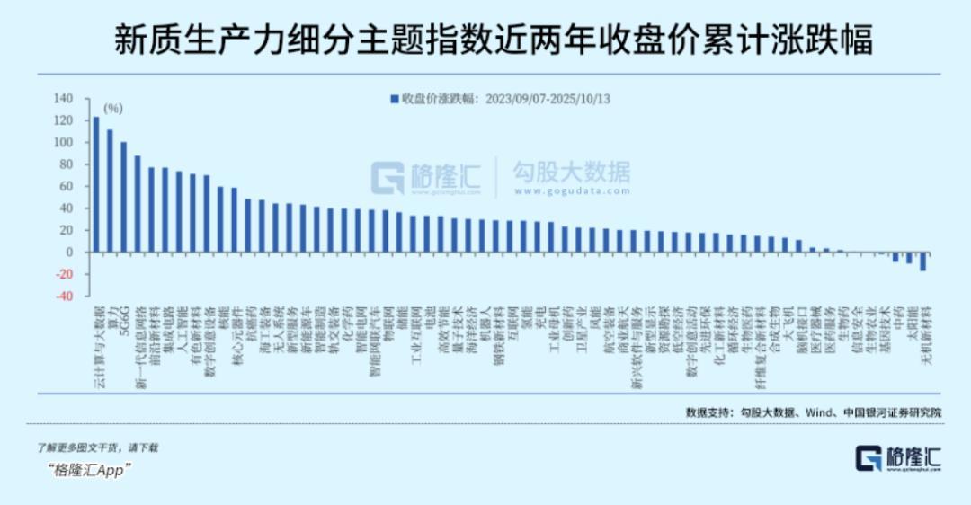 在过去的两年里,资金丟新质生产力概念涉及到的赛道予以青睐,绝大部分细分主题都积累了正向收益。其中云计算与大数据、算力、5G6G涨幅都超过了 100%。集成电路、有色新材料、核能、核心元器件等细分主题指数也涨超50%。