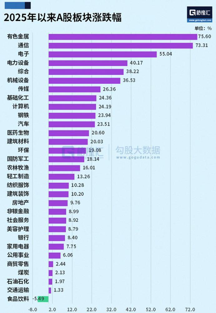 据格隆汇统计,2025年以来申万一级行业里涨幅居前的十大板块分别是有色金属、通信、电子、电力设备、综合、机械设备、基础化工、计算机、钢铁以及汽车。