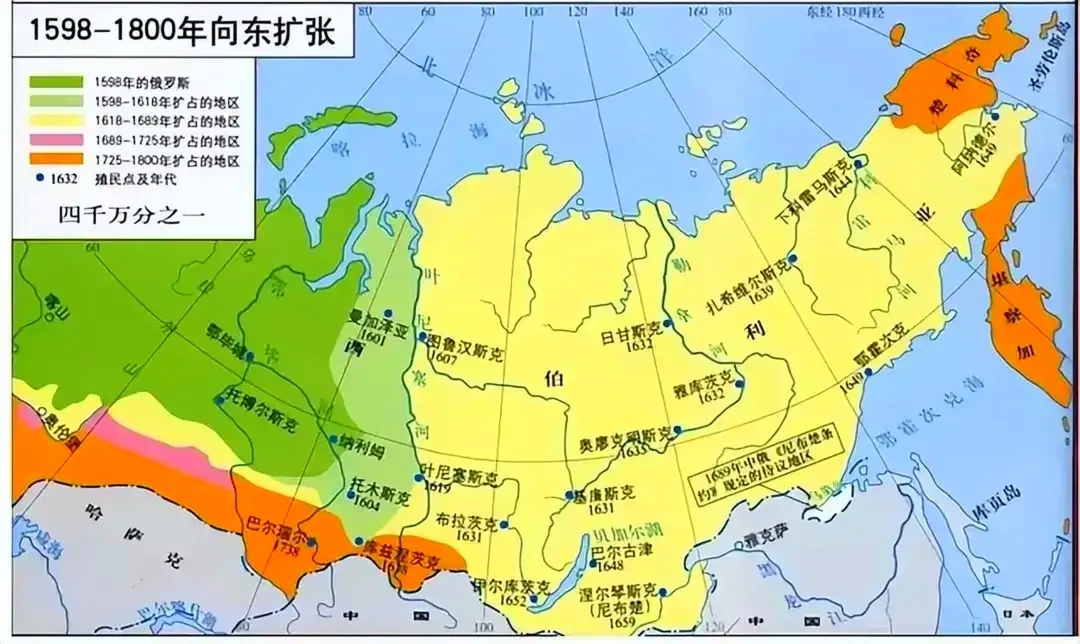与此同时,核心领土位于东欧平原的俄国自16世纪末开始向东扩张,没想到短短半个世纪,俄国就鲸吞西伯利亚,扩张至太平洋沿岸。