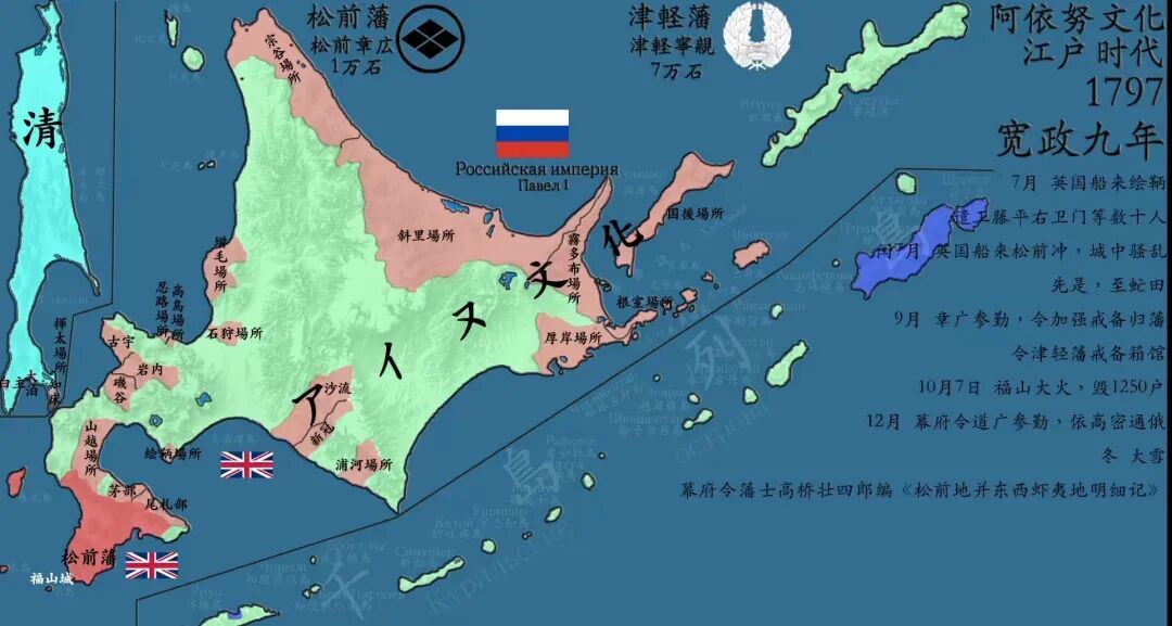 同一时期,俄国鲸吞西伯利亚,扩张至太平洋岸边,俄国沿着堪察加半岛-千岛群岛快速南下,也将扩张目标瞄准北海道。