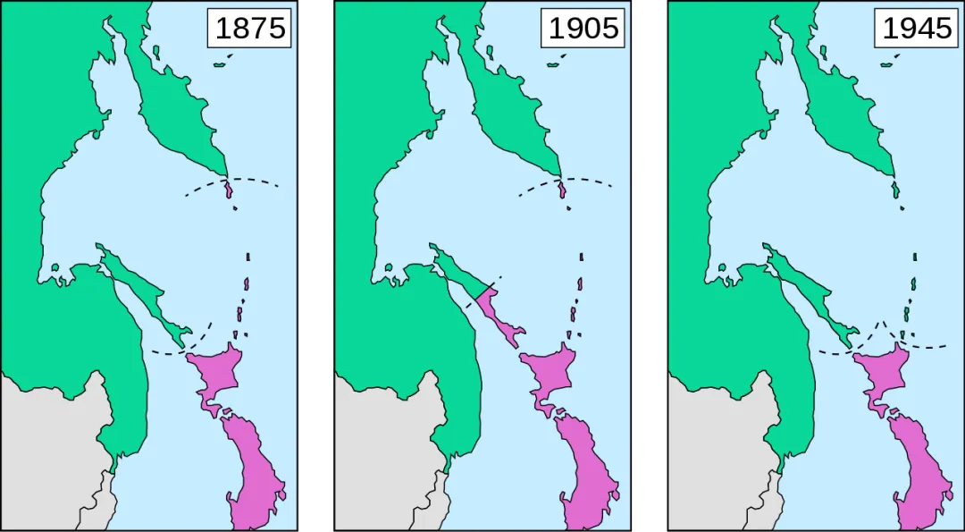 1904年,日俄终因在中国东北、朝鲜半岛的“殖民利益冲突”。日本艰难取胜,但俄国并不准备赔款,仅仅是让出了在中国东北的权益。同时以北纬50度为界,将库页岛南部(3.6万平方公里)割让给日本。