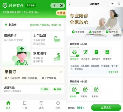 据《2024年北京市老龄事业发展报告》显示,全市60岁及以上人口占比达23.5%,朝阳区老龄化程度较高,养老服务呈现“高频、刚需、高品质”特征。依托区域“三级三边”为老服务体系优势,“时光有伴”链接本地优质服务商,优化线上线下服务闭环,形成三大核心服务板块,建立严格的服务商准入标准与服务流程。针对失能老人等重点群体,平台推出“新公益计划”,每月提供100元消费补贴,同时通过“小老人助老老人”互助机制及公益补贴降低服务门槛。