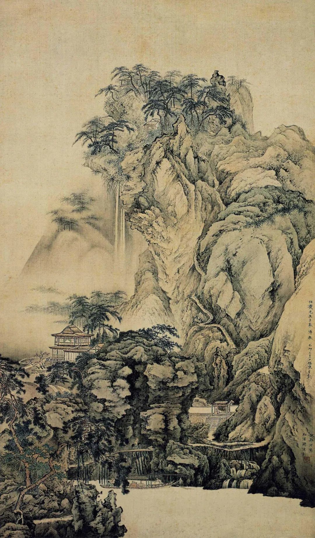 转益多师,博采众长,从明人唐寅、仇英得其秀逸清俊之气;从浙派戴进、吴伟得其磅礴生动之致;从元代倪云林得其幽淡恬静之趣;再溯源而上,直追宋代郭熙雄健明洁之妙,马远、夏圭遒劲苍润之势。