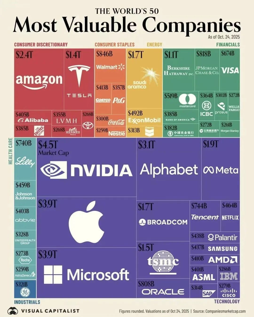 2,截至昨日(2025年10月29日),中国前十大互联网公司市值总和约1.83万亿美元,英伟达一家是其2.5倍。即便是放到相当能打的标普500指数里看,英伟达市值也占到其总市值的近1/10。
