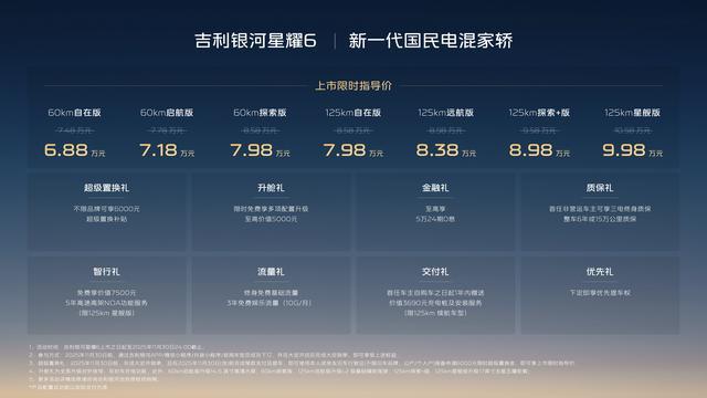 10 月 30 日,新一代国民电混家轿吉利银河星耀 6 迎来全球上市高光时刻!新车一口气推出 7 个版型,覆盖 60km 和 125km 两大续航梯队(含 60km 自在版、60km 启航版等),上市限时指导价仅 6.88 万 - 9.98 万元,性价比直接拉满。