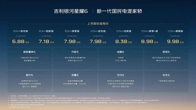 从6.88万元的起售价,到“三大最省”“四大越级”的产品力,银河星耀6的上市,不仅是吉利银河对“为美好生活而来”品牌主张的践行,更重新定义了国民家轿的价值标杆。它让买得起、开得省、用得好不再是选择题,而是标配。