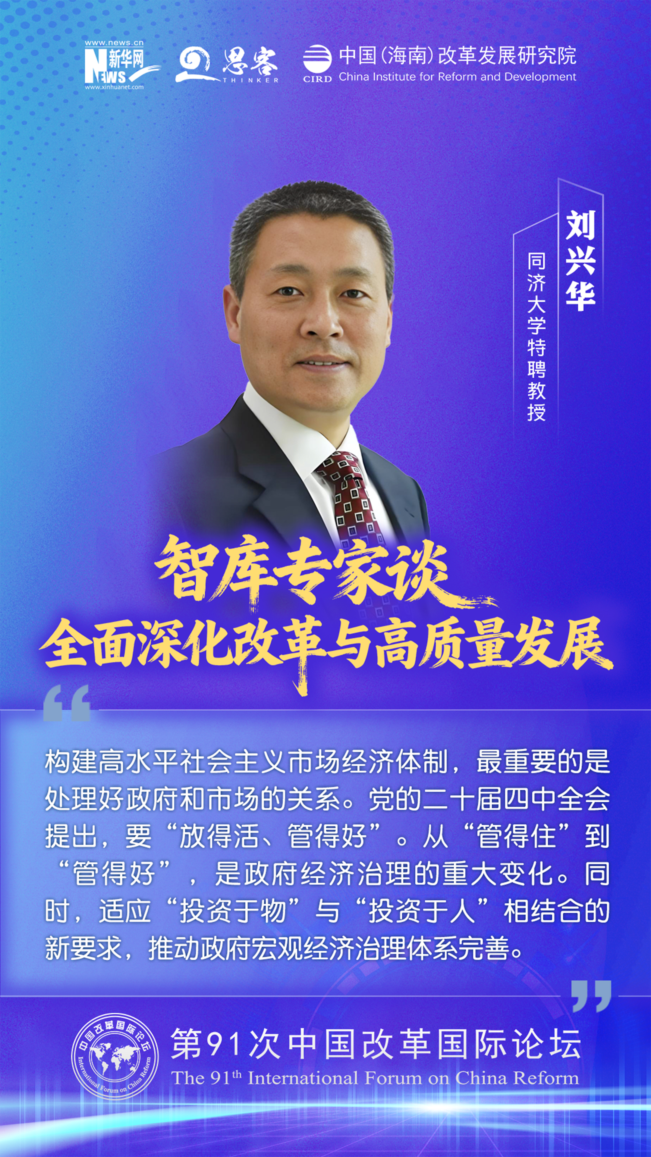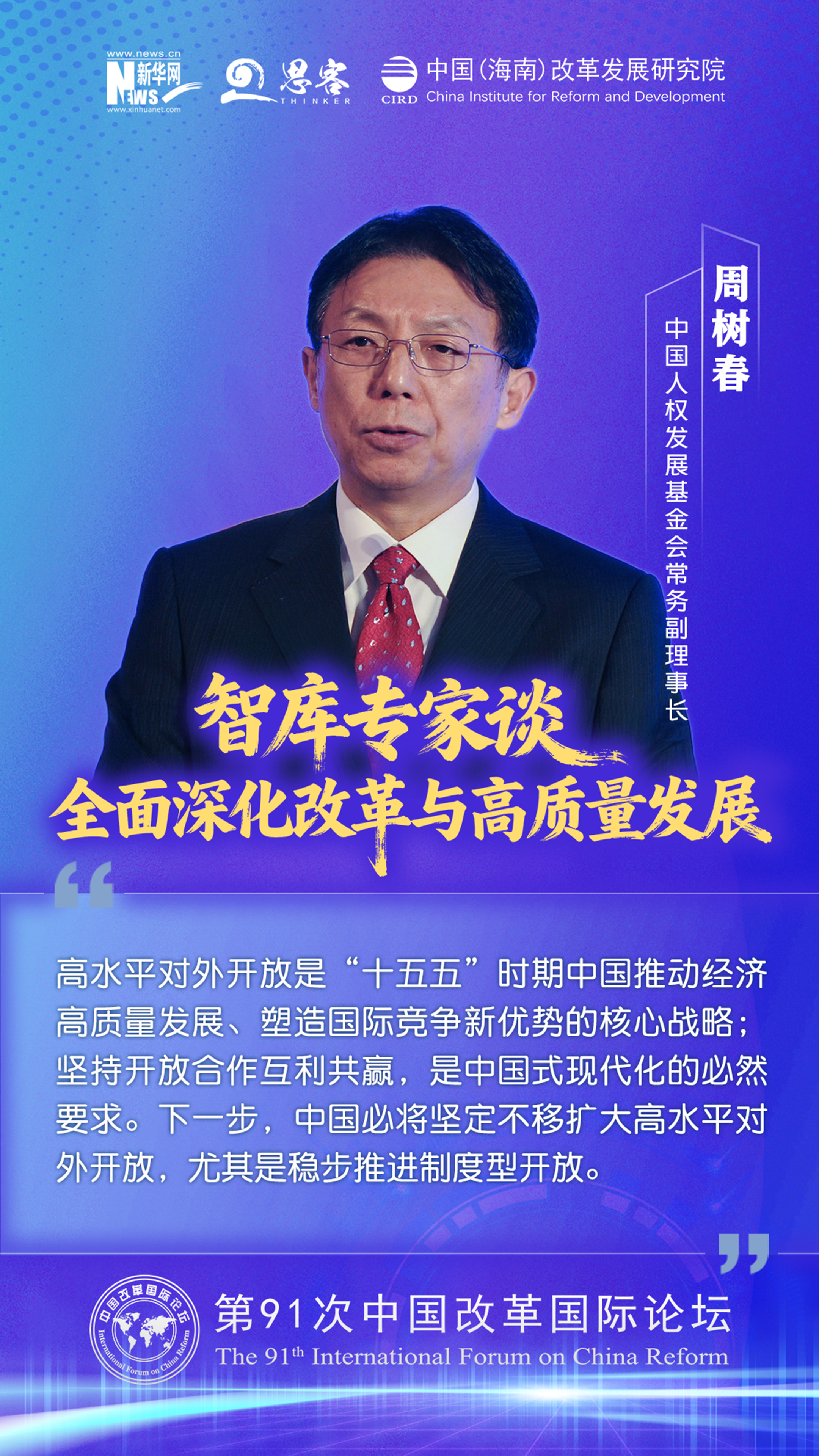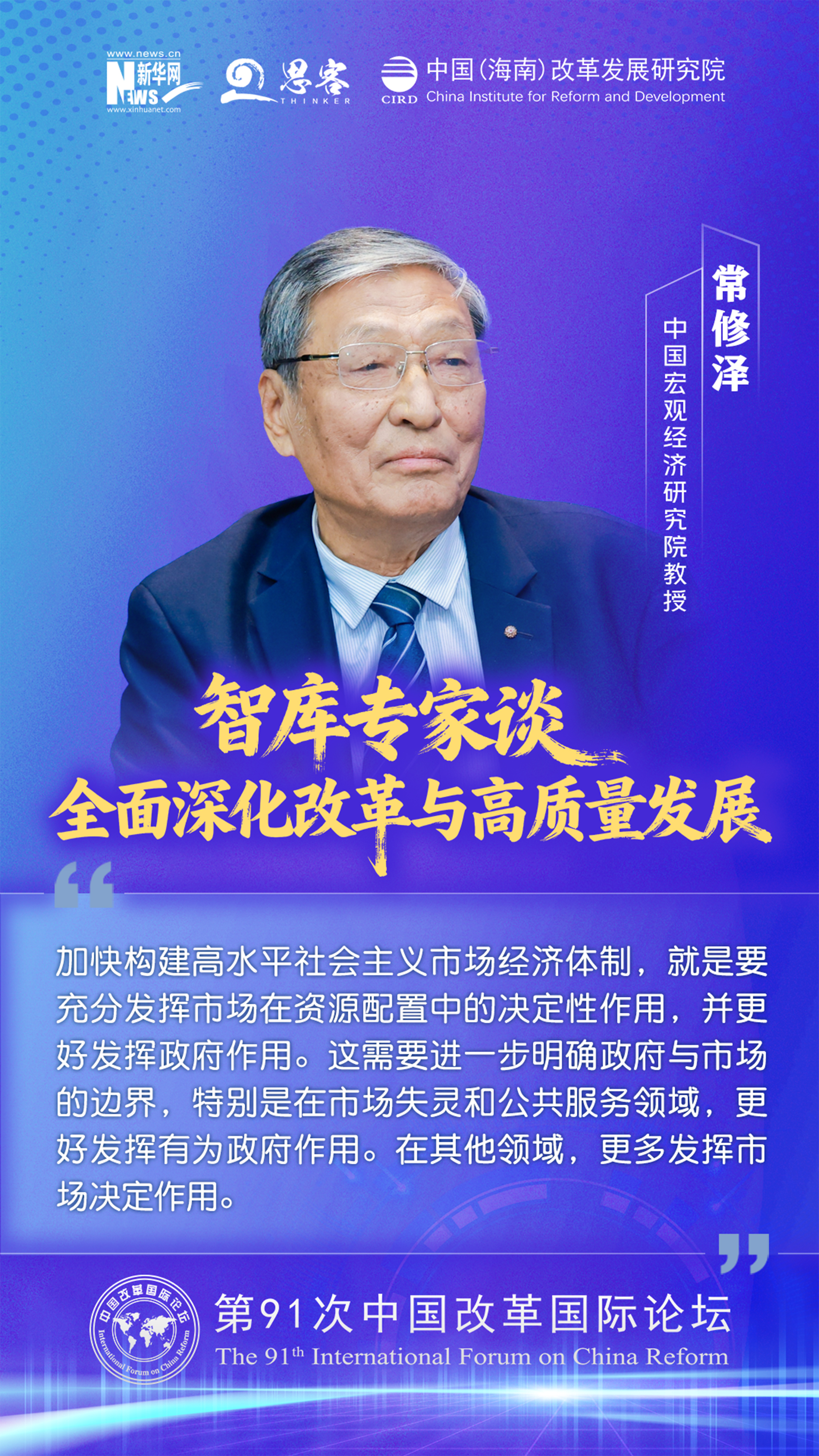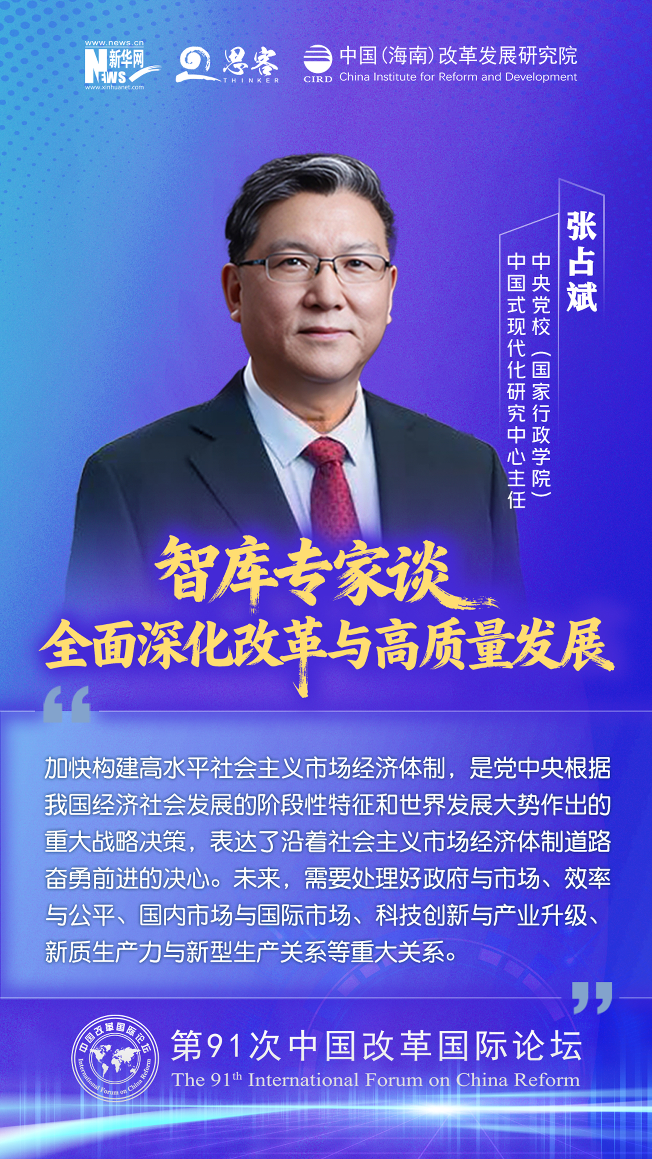 2025 年 11 月 1 至 2 日,由中国(海南)改革发展研究院、中国公共外交协会联合主办的“ 中国‘十五五’:全面深化改革与高质量发展——第 91 次中国改革国际论坛 ”在海口召开。与会专家学者围绕加快构建高水平社会主义市场经济体制与高水平开放促进高质量发展发表观点。
