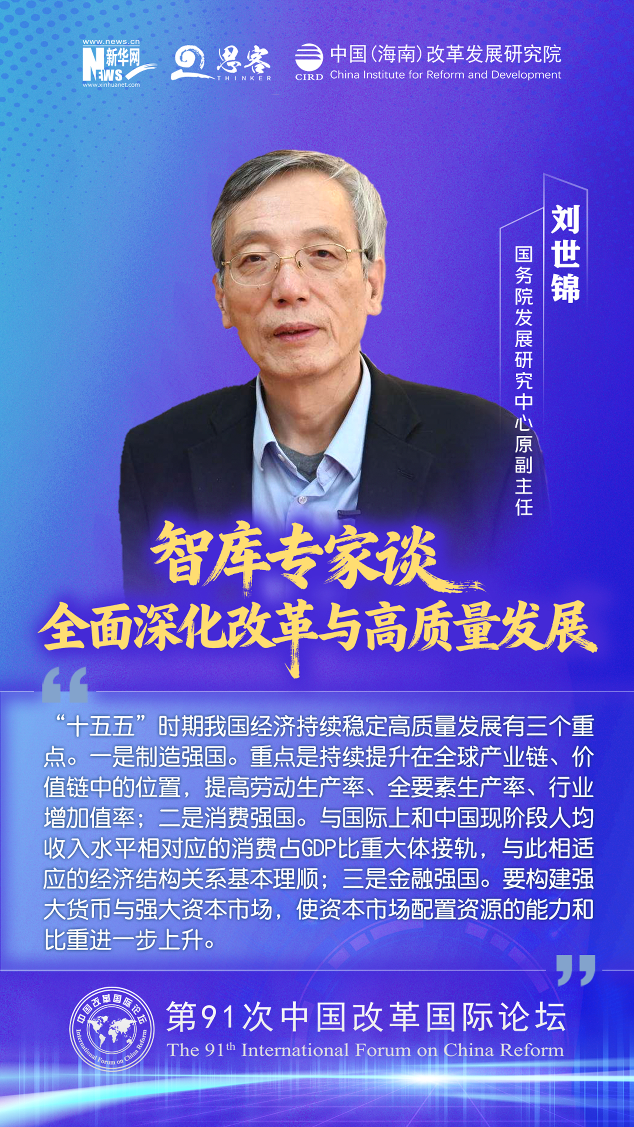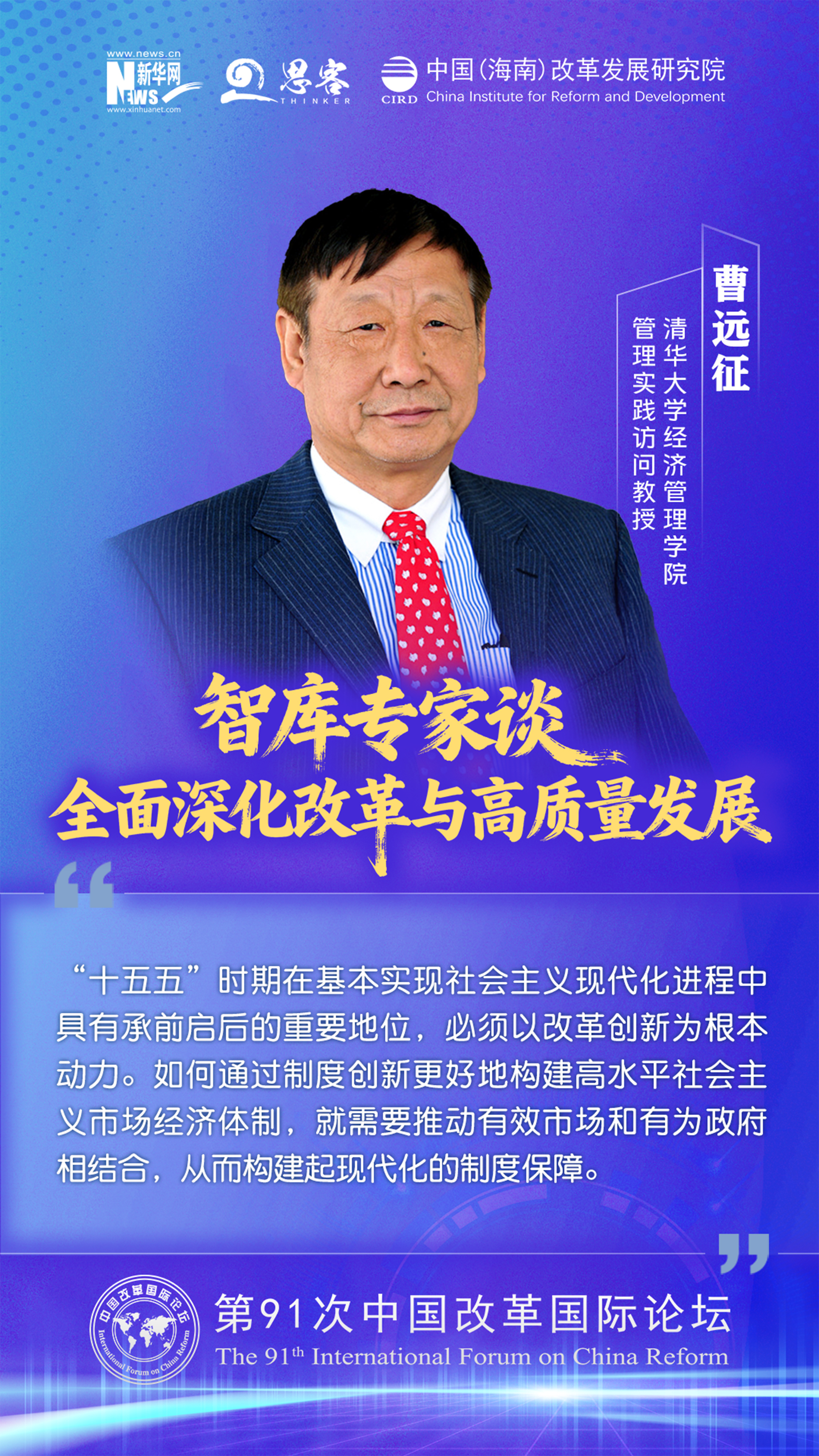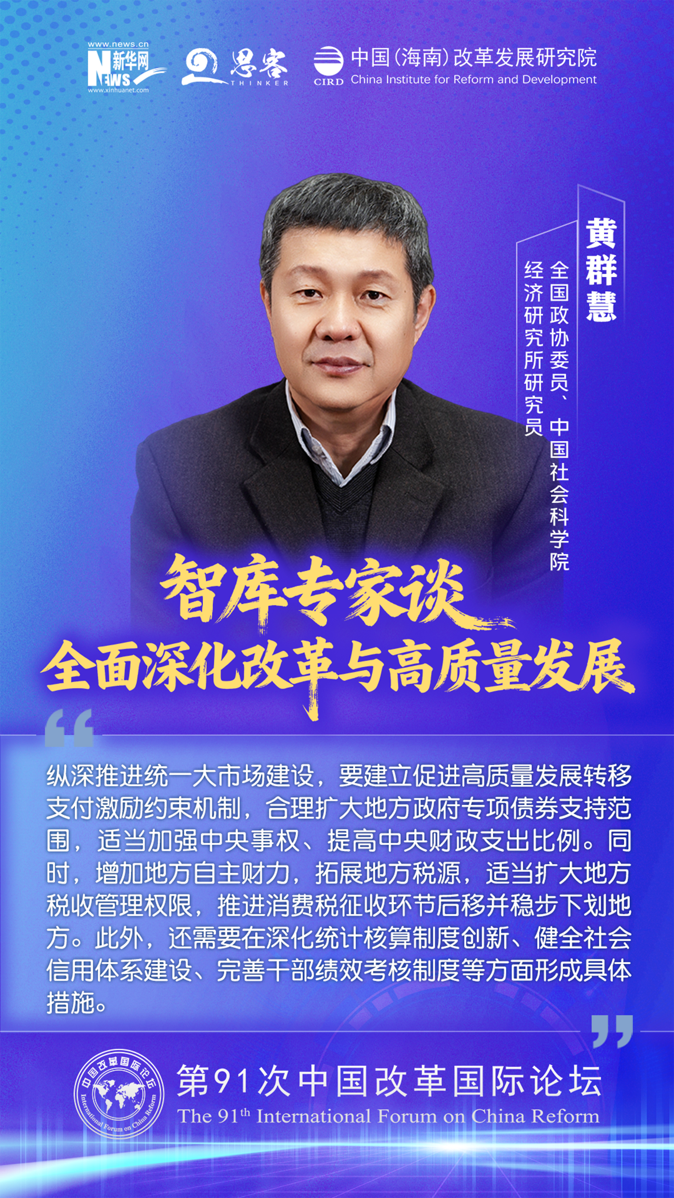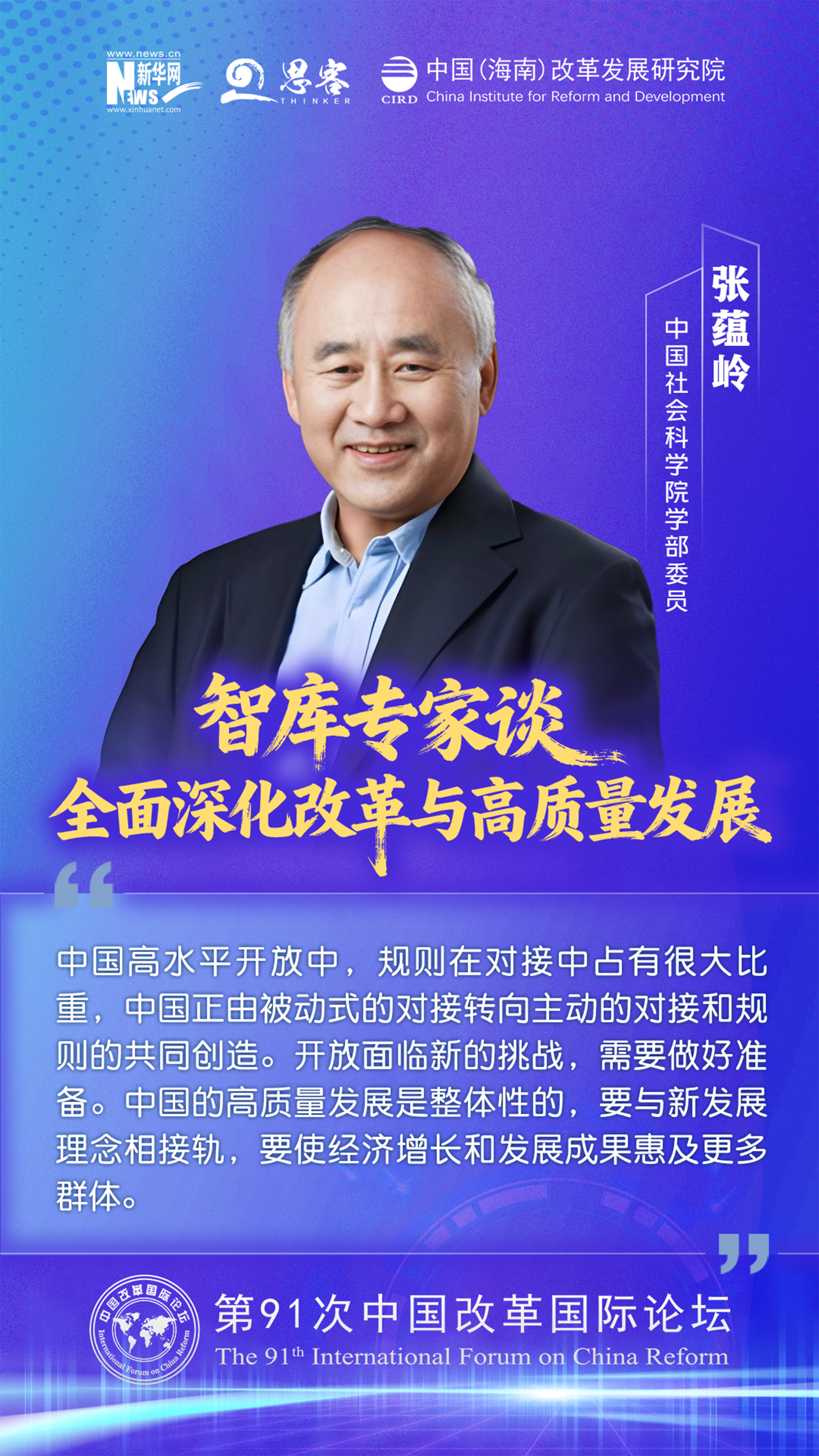 2025 年 11 月 1 至 2 日,由中国(海南)改革发展研究院、中国公共外交协会联合主办的“ 中国‘十五五’:全面深化改革与高质量发展——第 91 次中国改革国际论坛 ”在海口召开。与会专家学者围绕加快构建高水平社会主义市场经济体制与高水平开放促进高质量发展发表观点。