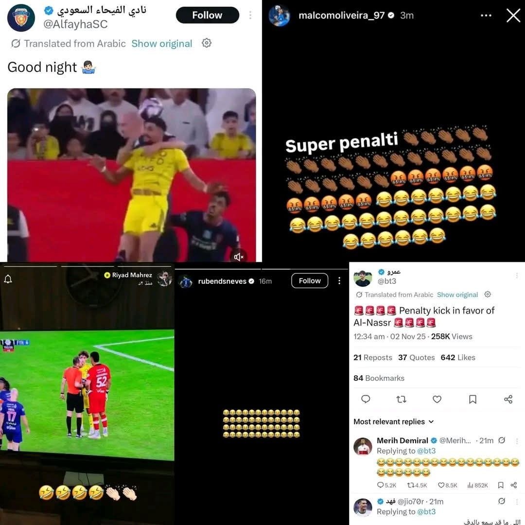 赛后,包括鲁本-内维斯、马赫雷斯、德米拉尔、马尔科姆在内的多位球星对点球判罚予以嘲讽。他们在社交媒体上发布动态,并贴上了“笑哭”及“鼓掌”的表情。