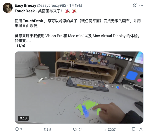 据了解,这款App的诞生源于开发者自己的真实痛点。他在使用Apple Vision Pro的Mac虚拟显示功能沉浸工作时,常想在纸上打草稿,但透过头显看不清纸笔;而官方的“无边记”体验又有一点“空中戳空气”的不真实感。于是,TouchDesk的核心创意诞生:“不如直接把桌面变成画板,用手指进行绘画,就像小时候在课桌上画画一样。” 同时,王锦泓还希望未来能接入SharePlay,让大家的自影像能远程面对同一个超大画板,如同线下般进行头脑风暴。