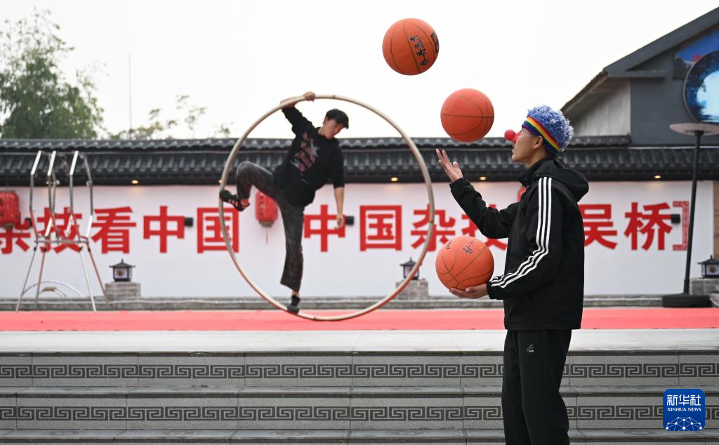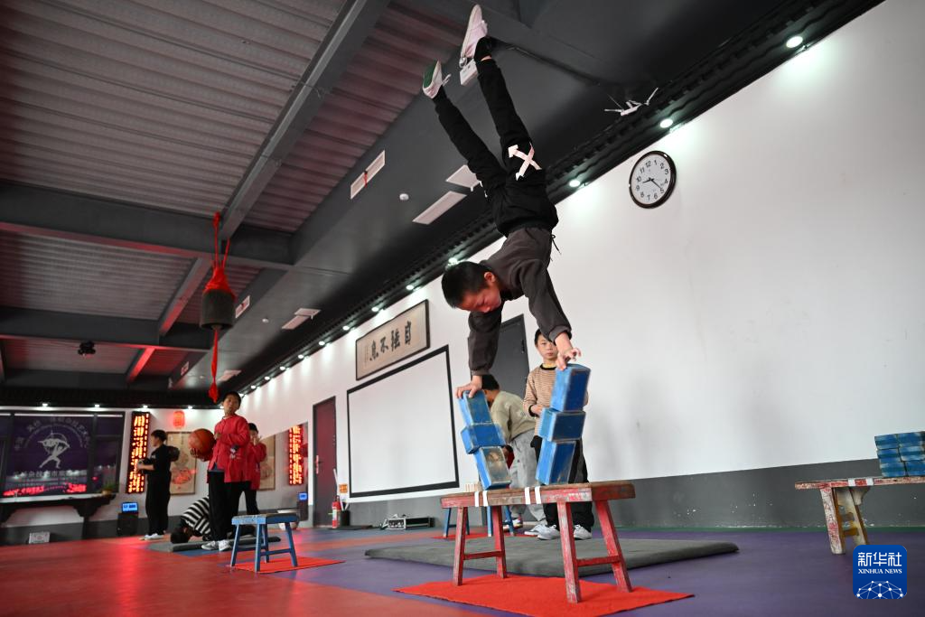 10月28日,河北省沧州市吴桥县大运河堤顶路沿线张硕杂技小院的学员练习杂技。