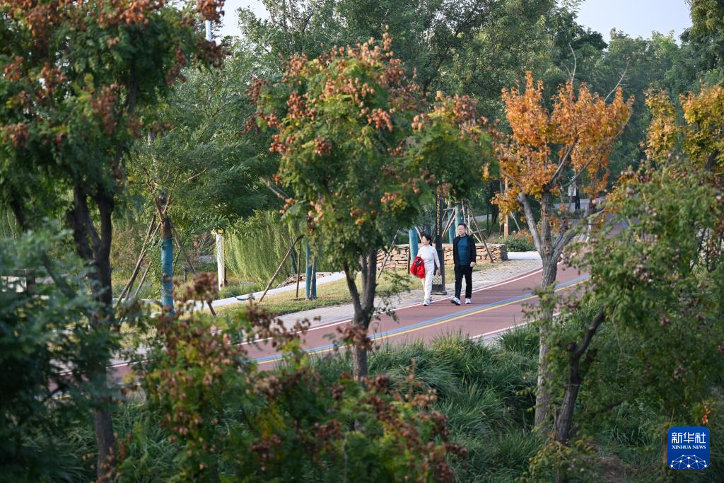 10月29日,市民在河北省沧州市运河区大运河堤顶路上散步。