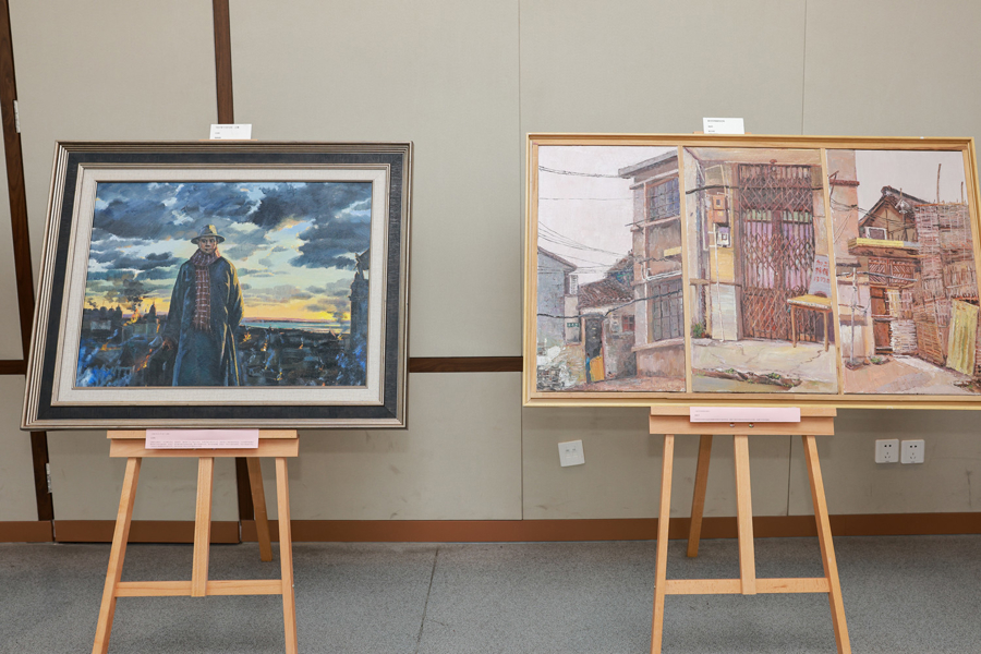 这些作品来自活跃在上海美术界的老中青年艺术家们的精心创作。例如,80岁老艺术家陆志文的《陈嘉庚故居》,笔触间流淌着对抗战期间爱国华侨领袖报国精神的敬意,兼具艺术创新与历史厚重感;雕塑中坚力量蒋进军的《无名英雄》,力量与美感兼备,诗意地致敬先烈、缅怀牺牲;青年艺术家谢晓霏的《烽火课堂,八秩回响》,以时空对话的巧妙方式,让和平的信念与坚韧的精神代代相传。架上绘画展独有的艺术特点,则让这些作品有了贴近市民的氛围,既保留艺术创作的完整细节,又能让大家近距离驻足观赏。