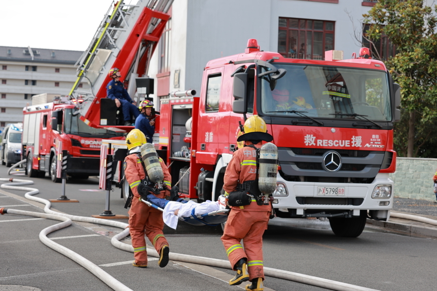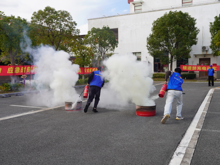 活动展示区,用火用电主题展板让人驻足围观。两支“安全啄木鸟”队伍现场开展“折叠担架救助人员操”“灭火器扑救初期火灾操”“一带一枪出水操”等项目,展现队伍初期火灾处置演练、熟练操作灭火器、人员疏散等培训成果。
