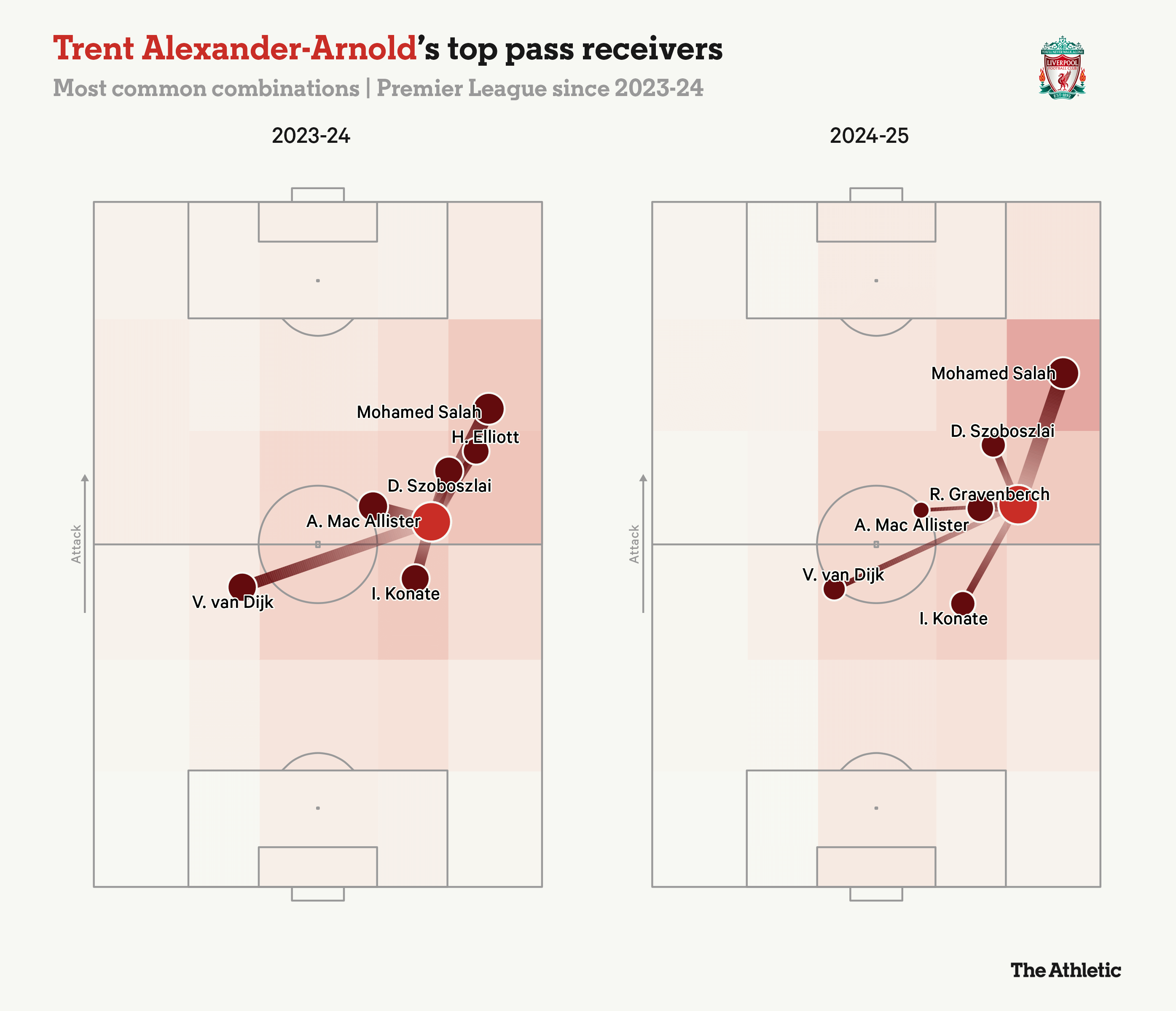 不可否认,斯洛特的球队本赛季在进攻组织上不如以往流畅,但上周末有一些积极信号,萨拉赫与队友的配合更加默契——这并不令人意外,因为主教练重新启用了接近上赛季夺冠阵容的首发。