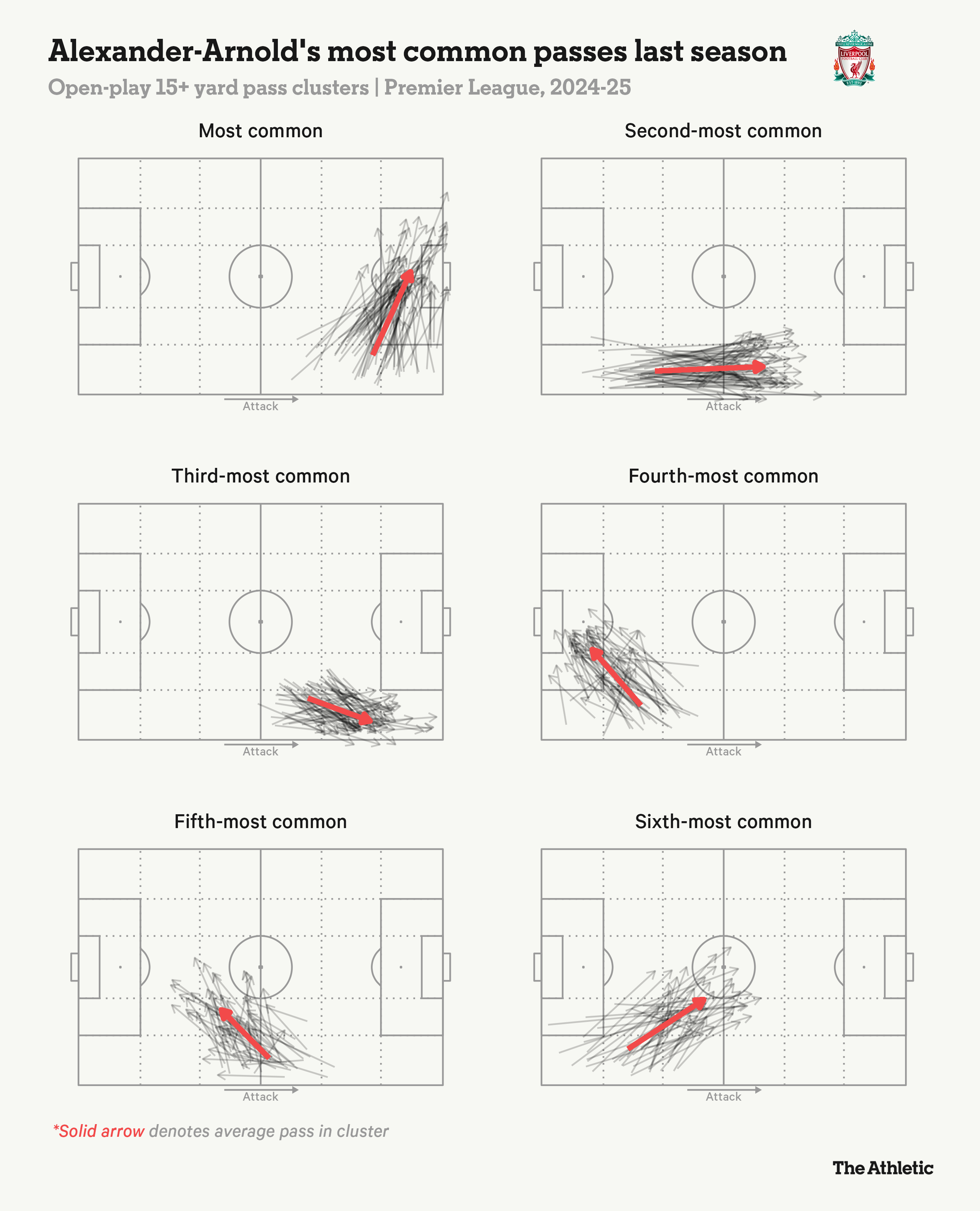下图突显了阿诺德上赛季最频繁的长传(超过15码),展示了那些快速传中对禁区内的威胁。