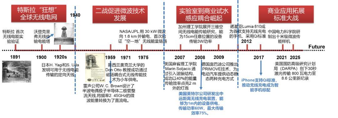 无线能量传输的发展史始于1891年特斯拉首次进行无线电能实验验证,1900年进行了沃登克里弗无线传输电能塔等尝试,20世纪20年代日本学者发明可用于无线电能传输的定向天线。