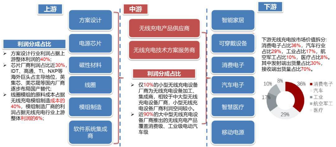 产业链中游为技术整合与产品制造,包括提供成品的无线充电器、模组等的无线充电产品供应商以及为不同行业提供定制化无线充电解决方案的无线充电技术方案服务商。可穿戴设备、消费电子、汽车电子、智慧医疗、移动电源等中游整合型产品方向。