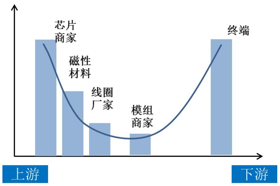 中游环节主要包括模组与方案设计,其中无线充电系统方案商通过为消费电子、工业设备和电动汽车等下游应用提供整体解决方案来布局市场。中游的模组制造分为发射端和接收端:发射端主要负责铁氧体、充电线圈等部件的集成,而接收端则涉及线圈、芯片、基板及其他元件的组装;该环节需与上游芯片厂商紧密协作,以优化电感、电容等参数,实现系统性能最佳。然而,由于模组制造本身技术门槛相对较低、难以形成持续竞争优势,中游企业往往通过入股或代工等方式积累技术,并逐步向产业链高利润环节延伸,以实现可持续发展和盈利。