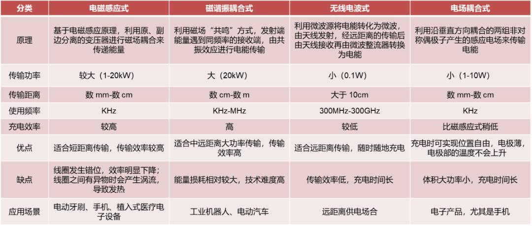 无线充电技术主要包括电磁感应式、磁谐振耦合式、无线电波式和电场耦合式四种类型,它们在原理、性能特点及应用场景等方面存在显著差异。
