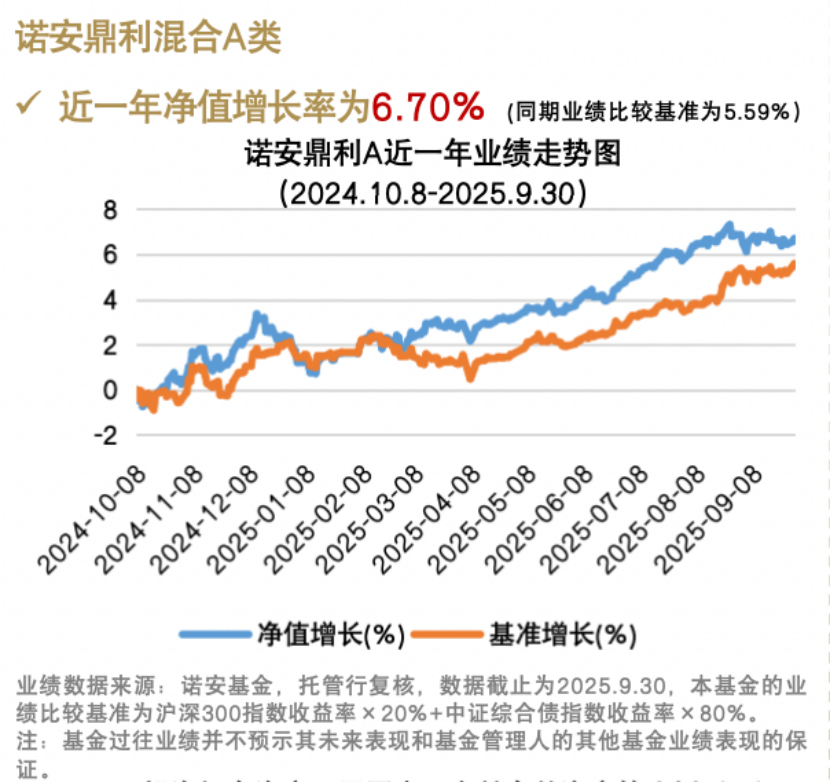 在经历权益市场的大幅波动后,“稳中求进”“守住收益”正成为投资者在市场下一阶段的核心目标。诺安鼎利努力实现“守得住、跟得上” 的平衡策略,助力投资者从容穿越周期。截至2025年9月30日,诺安鼎利A近一年净值增长率为6.70%,而同期业绩比较基准为5.59%。