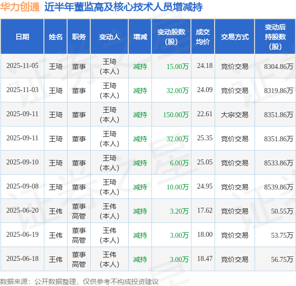 华力创通近半年内的董监高及核心技术人员增减持详情如下: