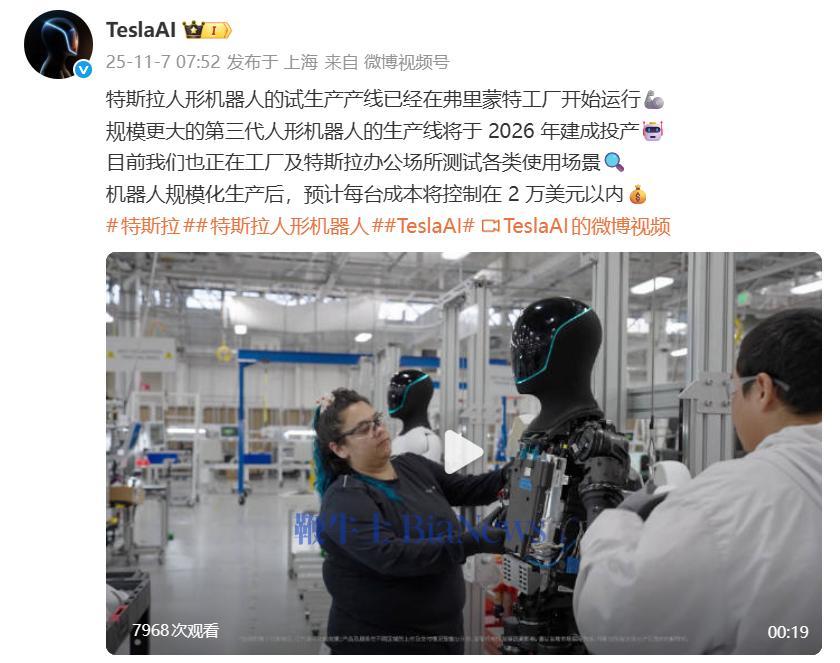 官方表示,目前公司正在工厂及特斯拉办公场所测试各类使用场景,机器人规模化生产后,预计每台成本将控制在2万美元以内。