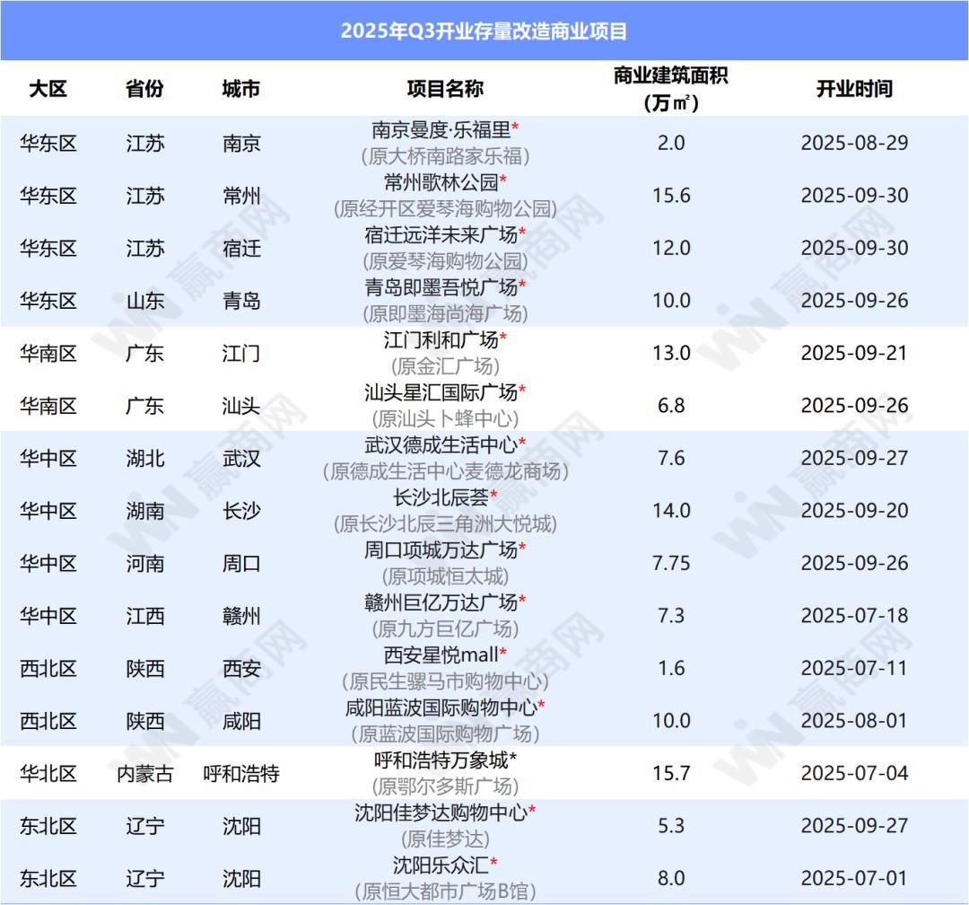 第三季度开业项目中,存量改造开业项目仍占一席之地,共15个,商业体量约137万平方米。