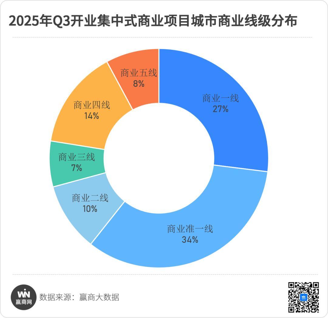 第三季度新开项目中,商业高线级城市的主要市场地位不变,且表现相当突出,占比超七成,其中商业一线城市占比27%,商业准一线城市占比34%,商业二线占比10%。