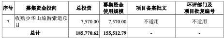 同时,股权收购方面,约3.7亿元将用于收购太华索道股权项目,约1.47 亿元用于收购瑞光阁股权项目,0.76 亿元用于收购少华山旅游索道项目。