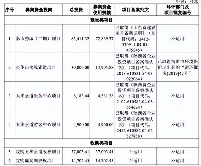 其中,7.29亿元将投入泰山秀城(二期)项目,约 1.39 亿元用于少华山南线索道项目,约0.46 亿元投向太华索道服务中心项目,0.49 亿元用于太华索道游客中心项目。