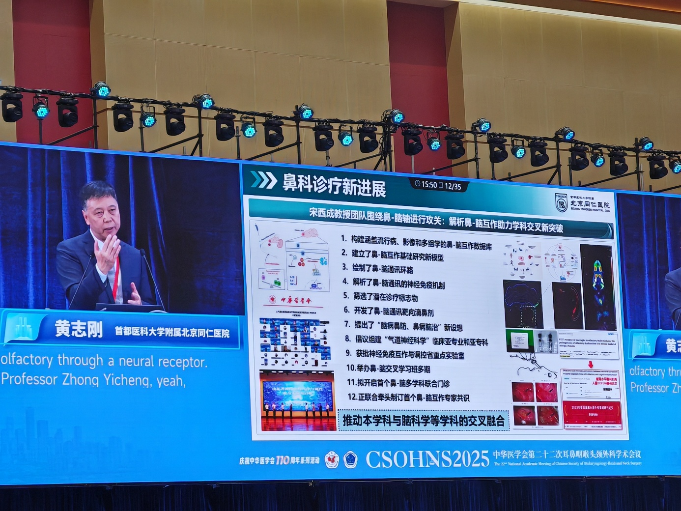 大会开幕式后主旨讲座中,中华医学会耳鼻咽喉头颈外科分会主任委员黄志刚特意对医院近年来围绕鼻-脑轴进行的重点攻关项目——解析鼻-脑互作助力学科交叉取得的新突破,给予了高度评价和鼓励。
