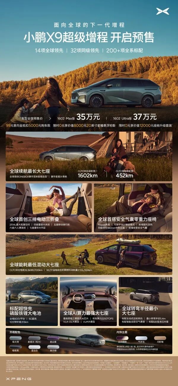 扉旅汽车讯:11月6日,小鹏X9增程版正式开启预售,共推2款车型,预售价分别为35万元和37万元。增程版也是终端期望值很高的一个版本,对于一些MPV用户而言,是更想要一个省事、远行可以不考虑充电问题的选择。新车搭载小鹏鲲鹏超级增程技术,采用800V高压平台,CLTC工况下纯电续航里程452公里,综合续航里程1602公里。