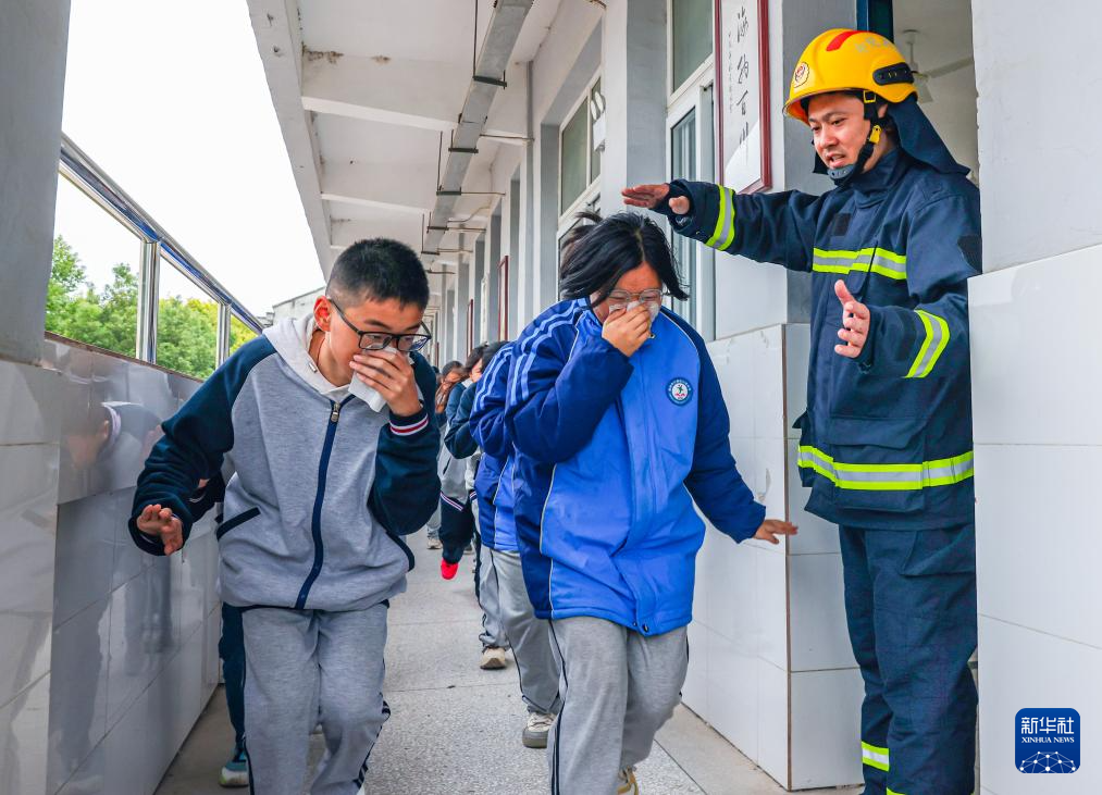 11月7日,在江苏省扬州市江都区小纪中学,扬州市江都区消防救援大队小纪专职队队员指导学生开展火灾疏散逃生演练。