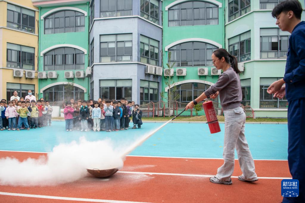 11月6日,在浙江省余姚市黄家埠镇中心幼儿园,老师在消防救援人员的指导下用灭火器灭火。
