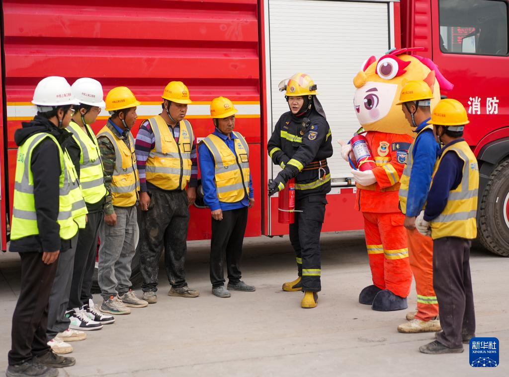 11月7日,在位于江苏省兴化市陈堡镇的中铁上海工程局盐宜铁路项目部工地,兴化市消防救援大队消防员指导工人正确使用灭火器。