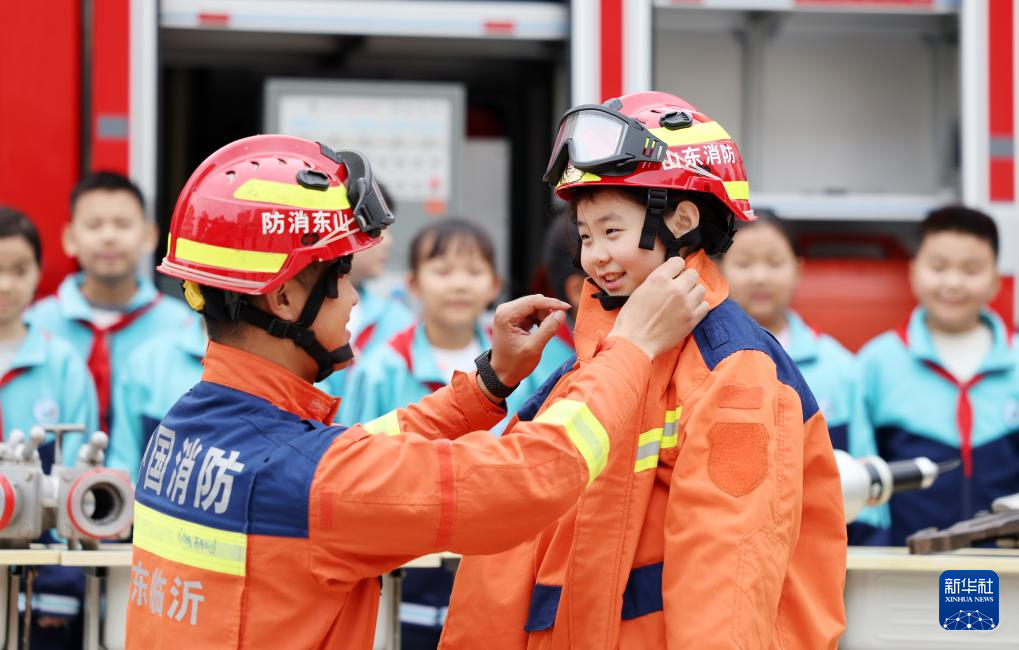 11月7日,在山东省临沂市郯城县第五实验小学,小学生在消防救援人员的帮助下体验消防员防护装备。