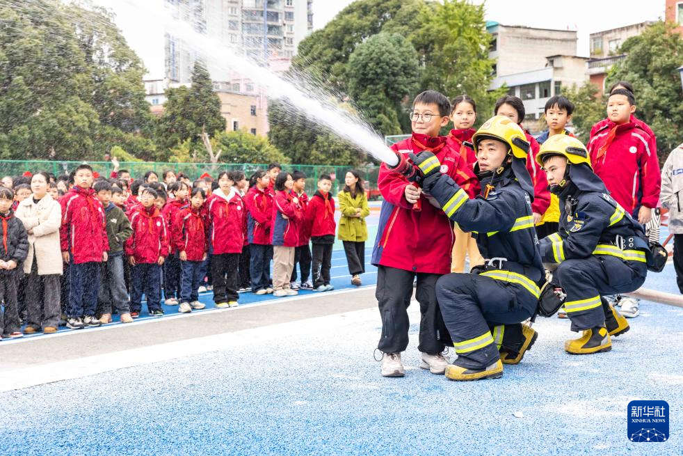 11月7日,贵州省安顺经济技术开发区消防救援大队消防员在安顺经济技术开发区实验小学指导学生使用消防水枪。