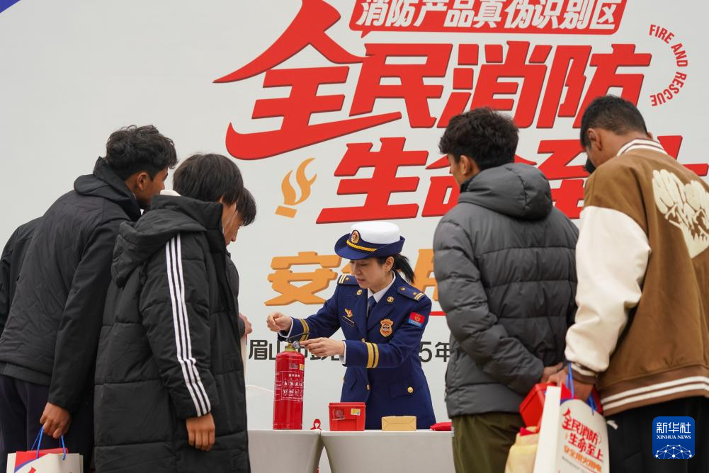 11月6日,在四川省眉山市彭山区2025年“119”消防宣传月启动仪式现场,消防队员为市民讲解消防知识。
