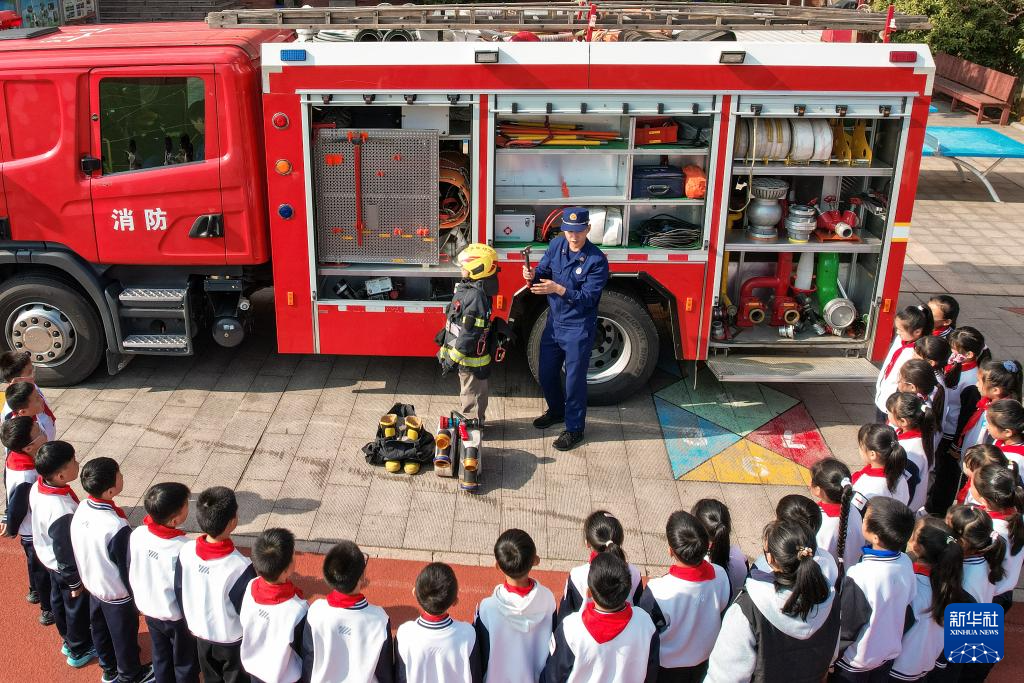 11月7日,消防救援人员在山东省青岛升平路小学为学生讲解消防装备知识(无人机照片)。