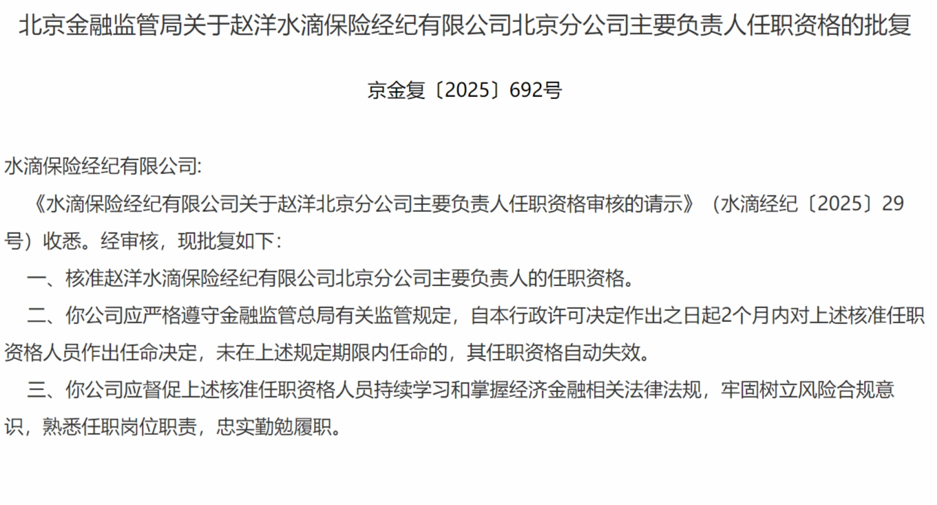 11月7日,北京金融监管局发布关于赵洋水滴保险经纪有限公司北京分公司主要负责人任职资格的批复,核准赵洋水滴保险经纪有限公司北京分公司主要负责人的任职资格。