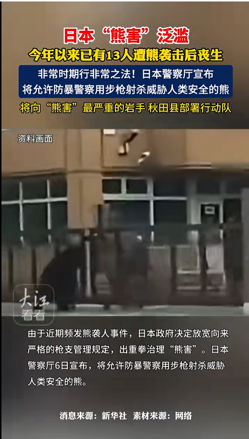 此前据央视新闻消息,当地时间6日,日本警察厅宣布,决定放宽向来严格的枪支管理规定,出重拳治理“熊害”,允许防暴警察用步枪射杀威胁人类安全的熊。新规于13日(下周四)开始生效。4月1日至11月5日,日本已有13人遭熊袭击后丧生。日本媒体此前报道,各地普通警察配备的手枪杀伤力不足,对付熊的作用不大。