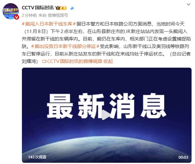 据@CCTV国际时讯 消息,据日本警方和日本铁路公司方面消息,当地时间今天(11月8日)下午2点半左右,在山形县新庄市的JR新庄站站内发现一头熊闯入并滞留在新干线的车辆库内。